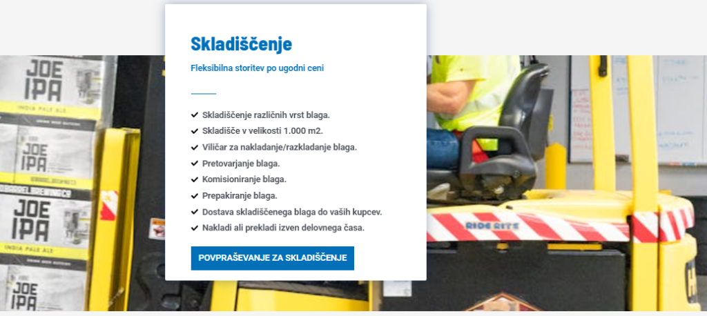 Naše podjetje nudi tudi skladiščenje. Naše opremljeno skladišče zagotavlja varno shranjevanje vaših blagovnih artiklov, opreme ali osebnih predmetov. Storitve skladiščenja so prilagojene za kratkotrajno ali dolgotrajno hrambo, odvisno od vaših potreb, pri čemer je zagotovljena popolna varnost (video nadzor 24/7) in dostopnost vaših stvari.